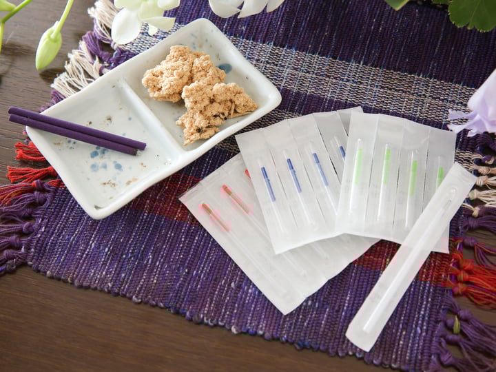 鍼については当院では直径0.12~0.18mm程度の鍼を使用しています。これは髪の毛と同じくらいの太さなので病院で行う注射よりはずっと細いもので刺すときの痛みは場所にもよりますがほとんど感じないくらいです。